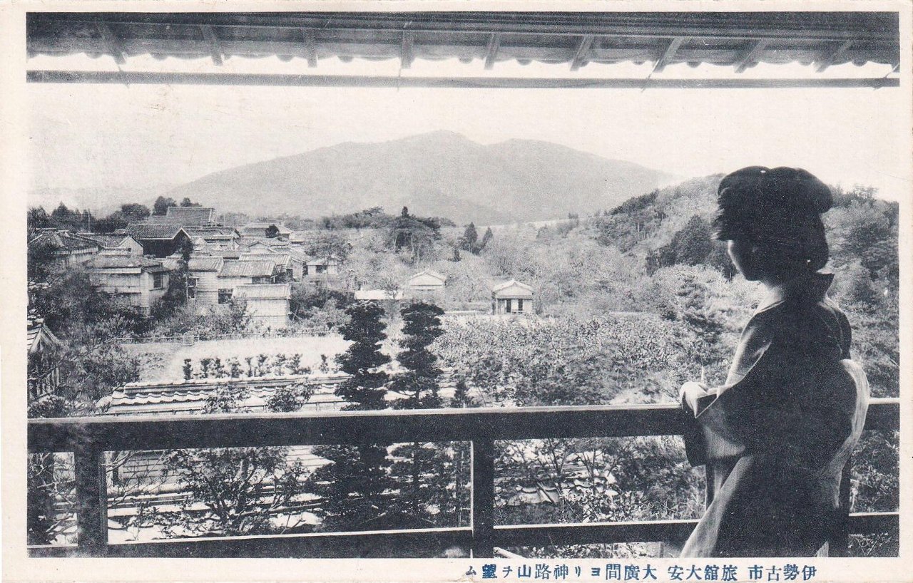 左:本館・別館 中:表バルコニー・応接室ヨリノ遠望 右:遠ク朝熊山ヲ望ム・別館前庭