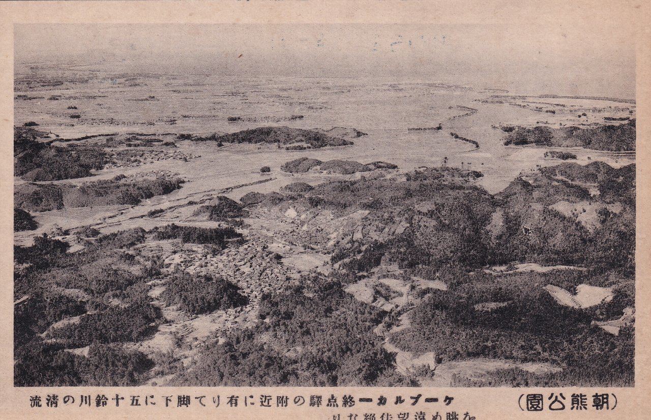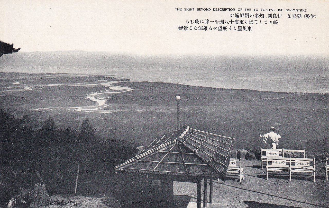 中:朝熊公園 ケーブルカー終点駅の付近に有りて脚下に五十鈴川の清流を眺め遠望佳絶なり。