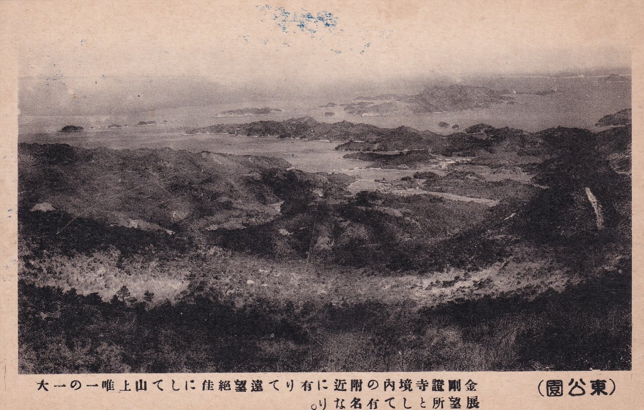 渺々たる碧海に島嶼点々とし松島に髣髴たる景観を呈する奥之院富士見台及鳥羽の観望