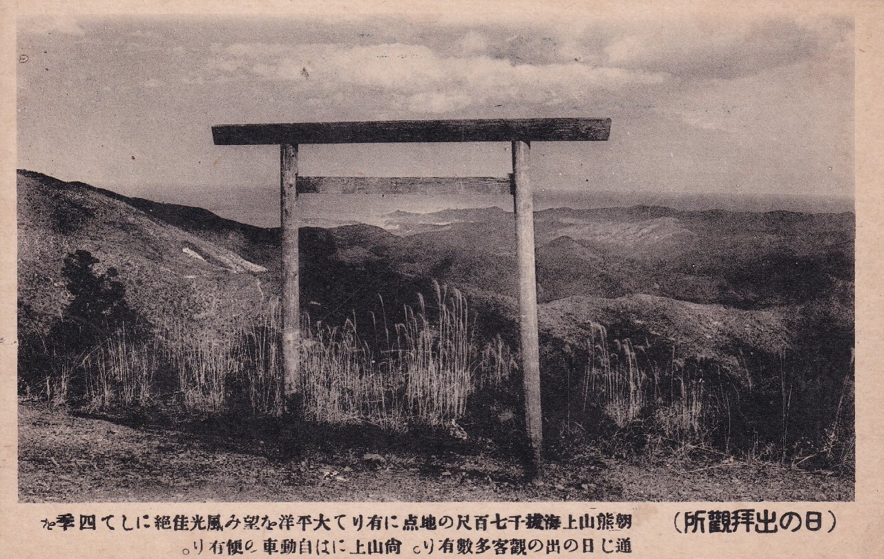 中:日の出拝観所 朝熊山上海抜千七百尺の地点に有りて太平洋を望み風光絶佳にして四季を通じ日の出の観客多数有り。尚山上には自動車の便有り。