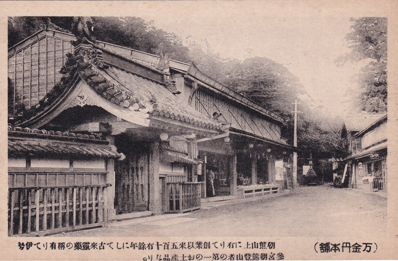 左:萬金丹本舗 朝熊山上に有りて創業以来五百十余年にして古来霊薬の称在有りて伊勢参宮朝熊登山者の第一の土産品なり。
