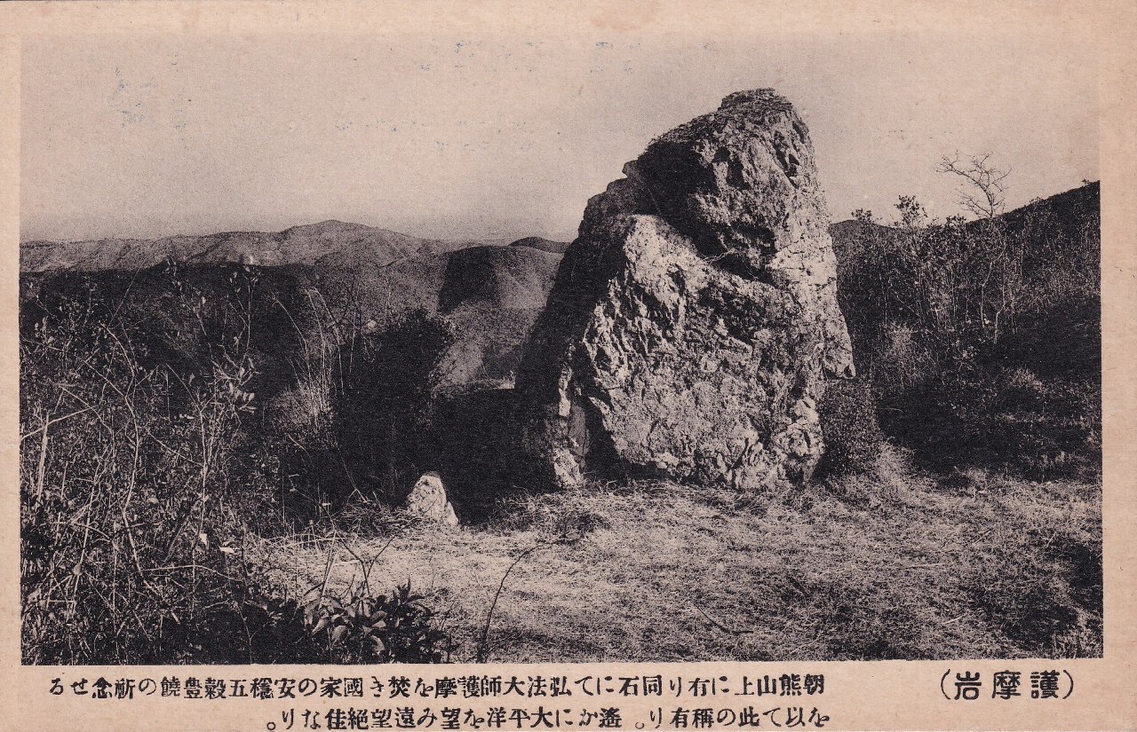 左:護摩岩 朝熊山上に有り同石にて弘法大師護摩を焚き国家の安穏五穀豊穣の祈願せるを以てこの称有り。遥かに太平洋を望み遠望絶佳なり。