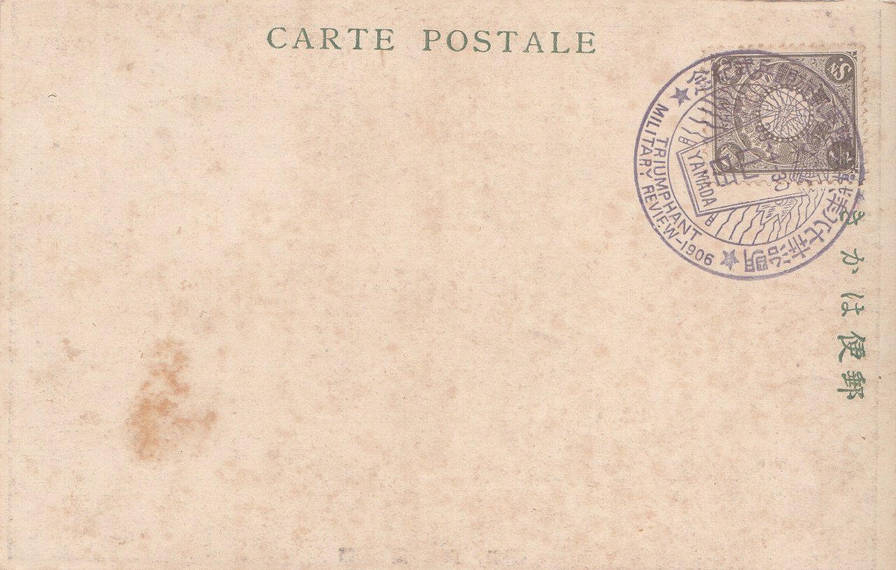 表面には「明治37・8年戦役陸軍凱旋観兵式記念」のスタンプが捺されています。