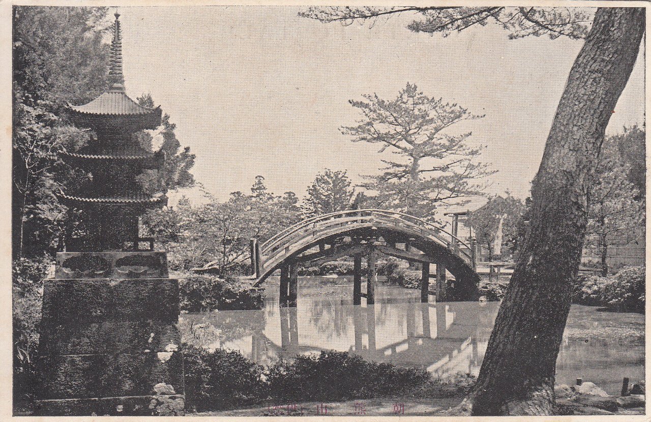 右:古池深き蒼碧の色を湛へ霊境に應はしき連珠池