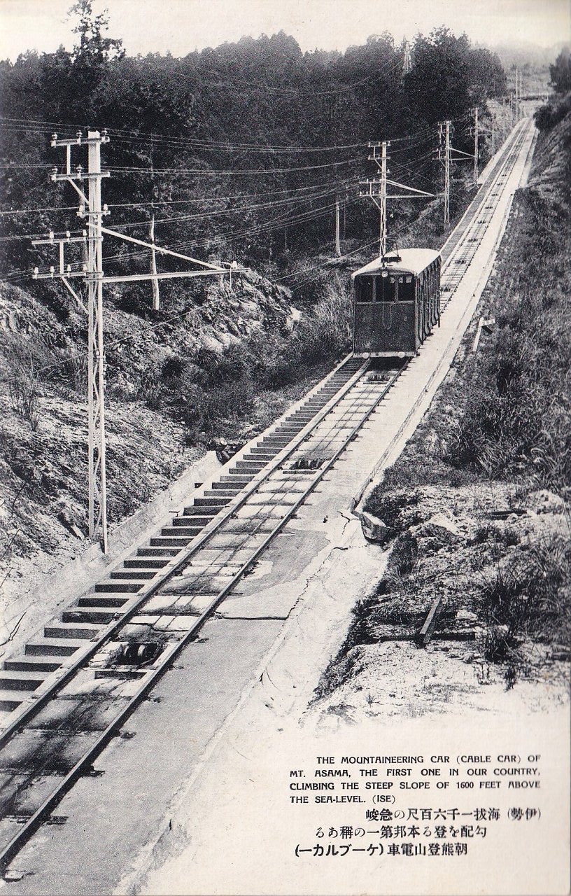 左:海抜一千六百尺の急峻勾配を登る本邦第一の称ある朝熊山登山電車