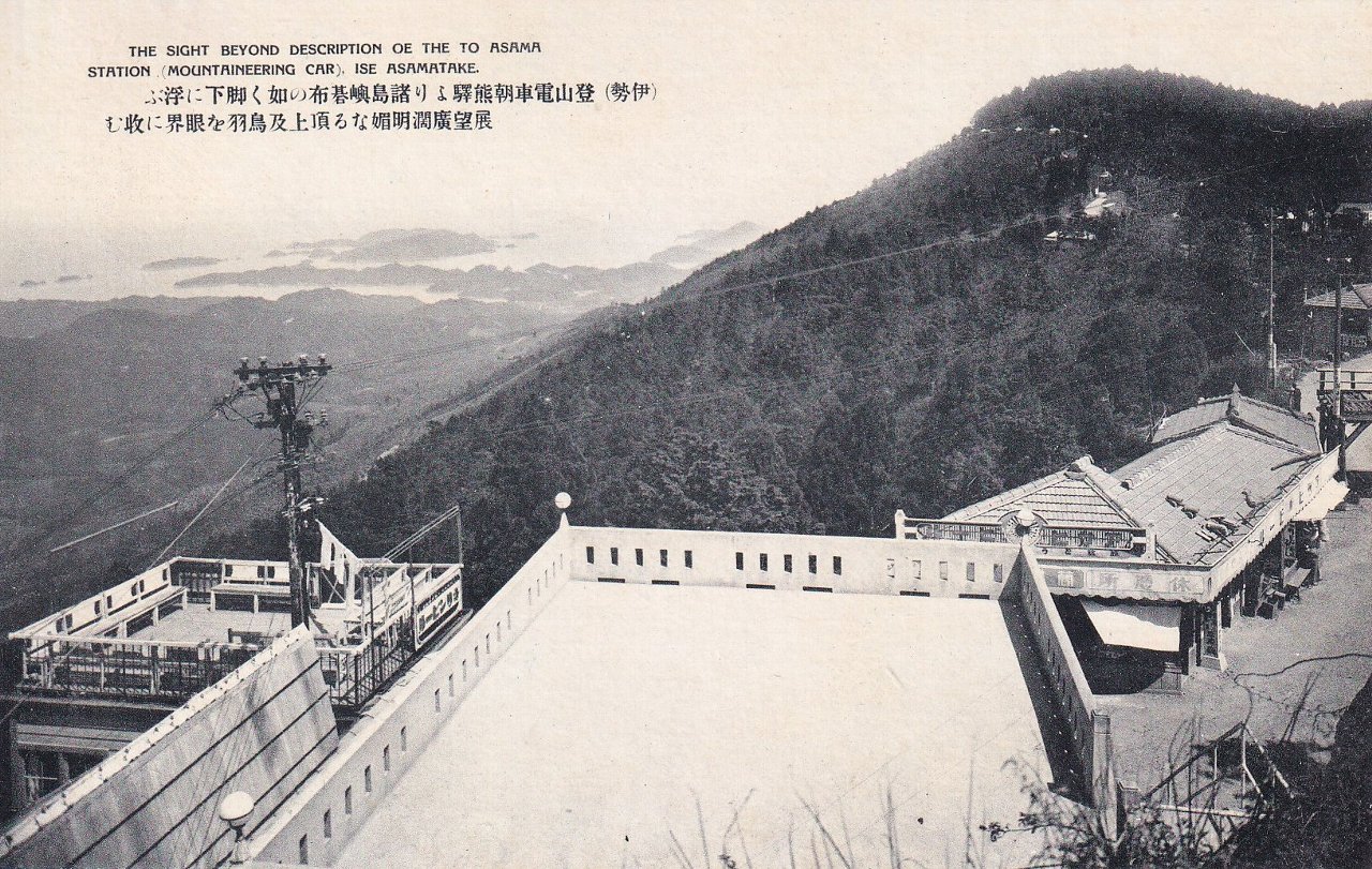 中:登山電車朝熊駅より諸島嶼碁布の如く却下に浮ぶ展望広闊明媚なる頂上及鳥羽を眼界に収む