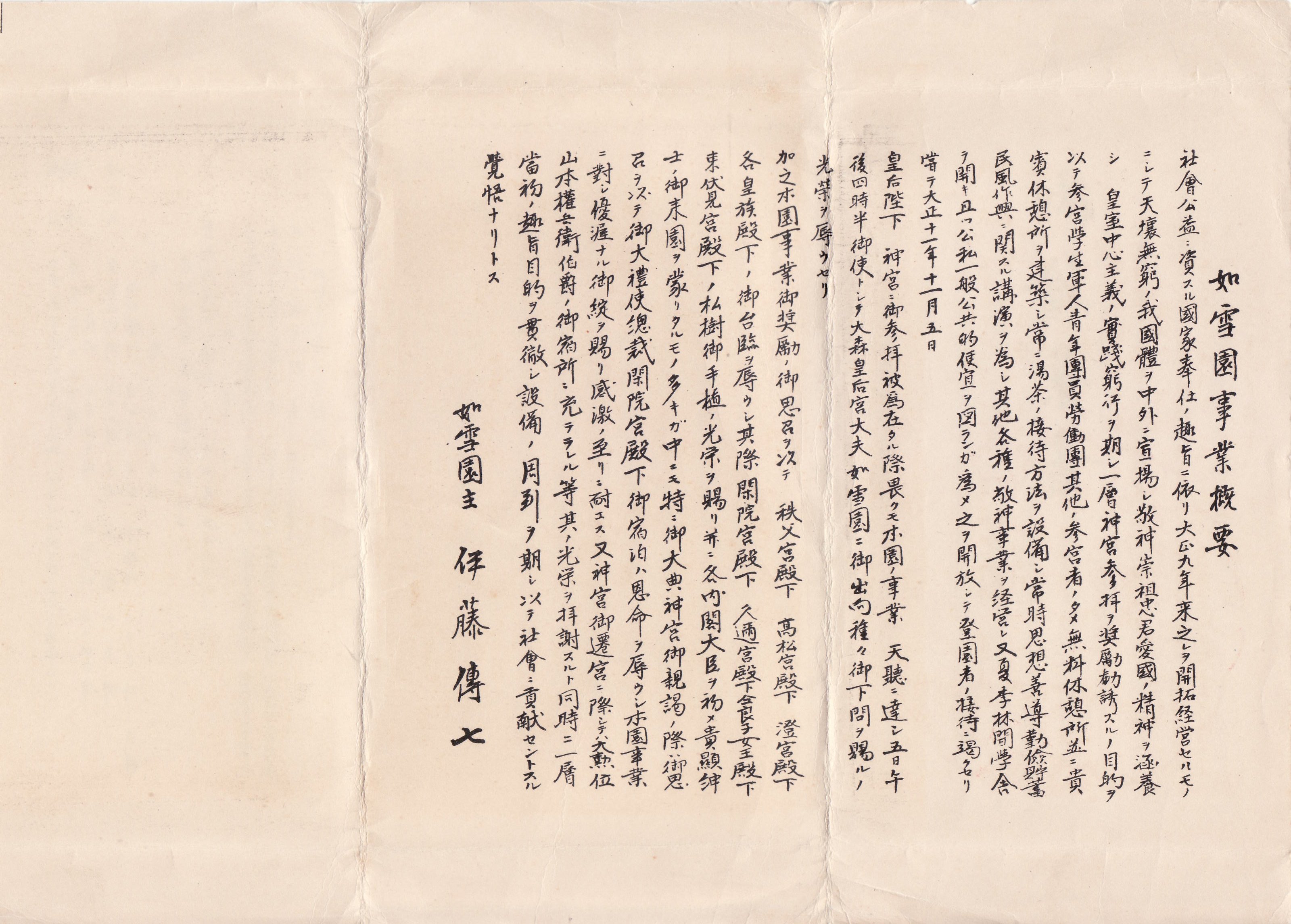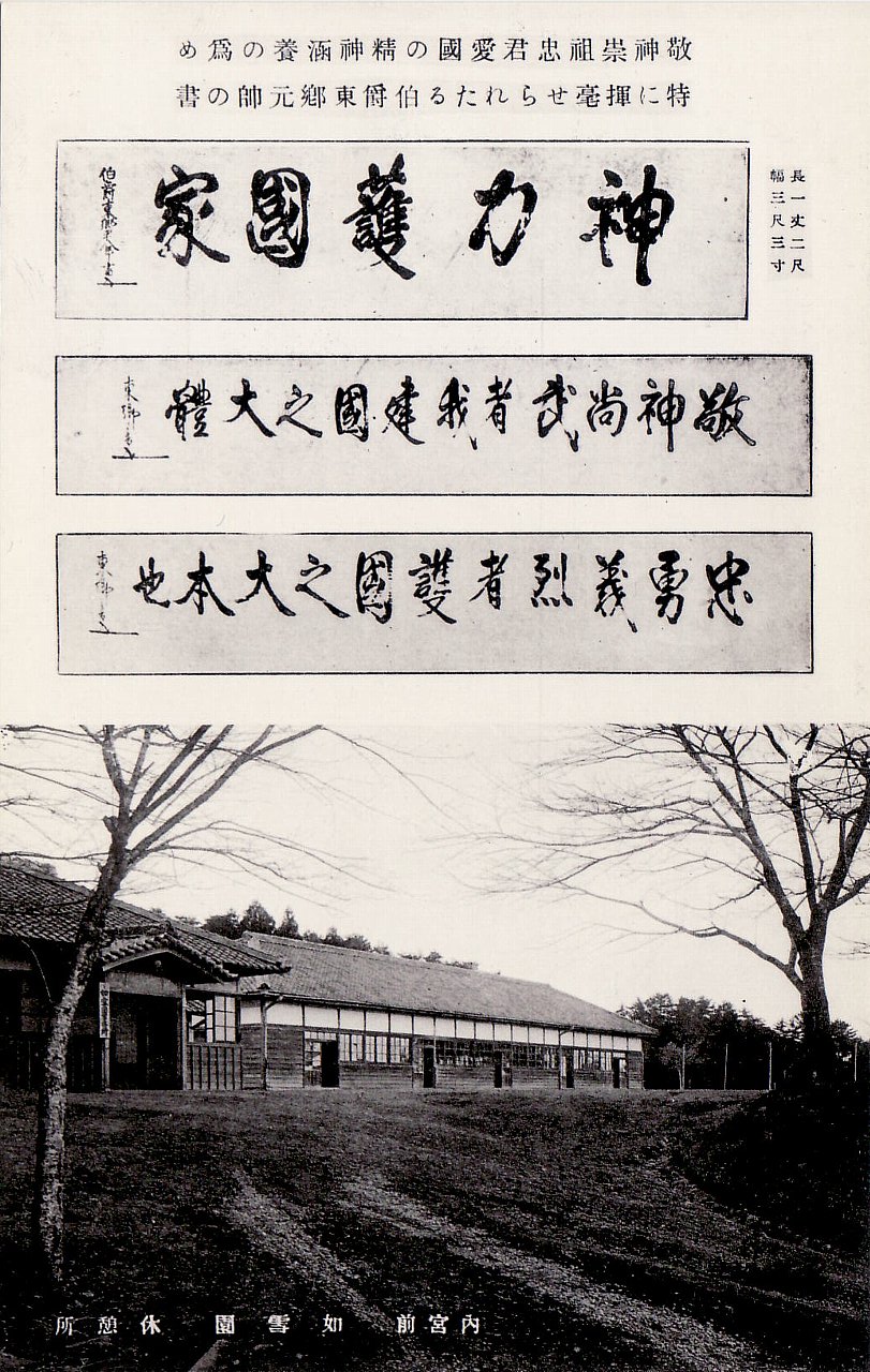社会公益に資する国家奉仕の趣旨に依り大正九年来之れを開拓経営せるものにして天壌無窮の我が国体を内外に宣揚し、敬伸崇祖忠君愛国の精神を涵養し(闕字=文中に貴人の名や称号などを書く時敬意を表すため、そのすぐ上を一字か二字あけて書くこと)皇室中心主義の実践窮行を期し一層神宮参拝を奨励勧誘するの目的を以て参宮学生軍人青年団労働団体其他の参宮者のため無料休憩所並に貴賓休憩所を建築し、常に茶湯の接待方法を設備し常時思想善導勤倹貯蓄民風作与に関する公演を為し其他各種の敬神事業を経営し又夏季林間学舎を開き且つ公私一般公共的便宜を図らんが為め解放して登園者の接待に竭(つ)くせり嘗て大正十一年五月(平出=文中に貴人の名や称号などを書く時、敬意を表すため改行して次の行頭にその文字を書くこと)