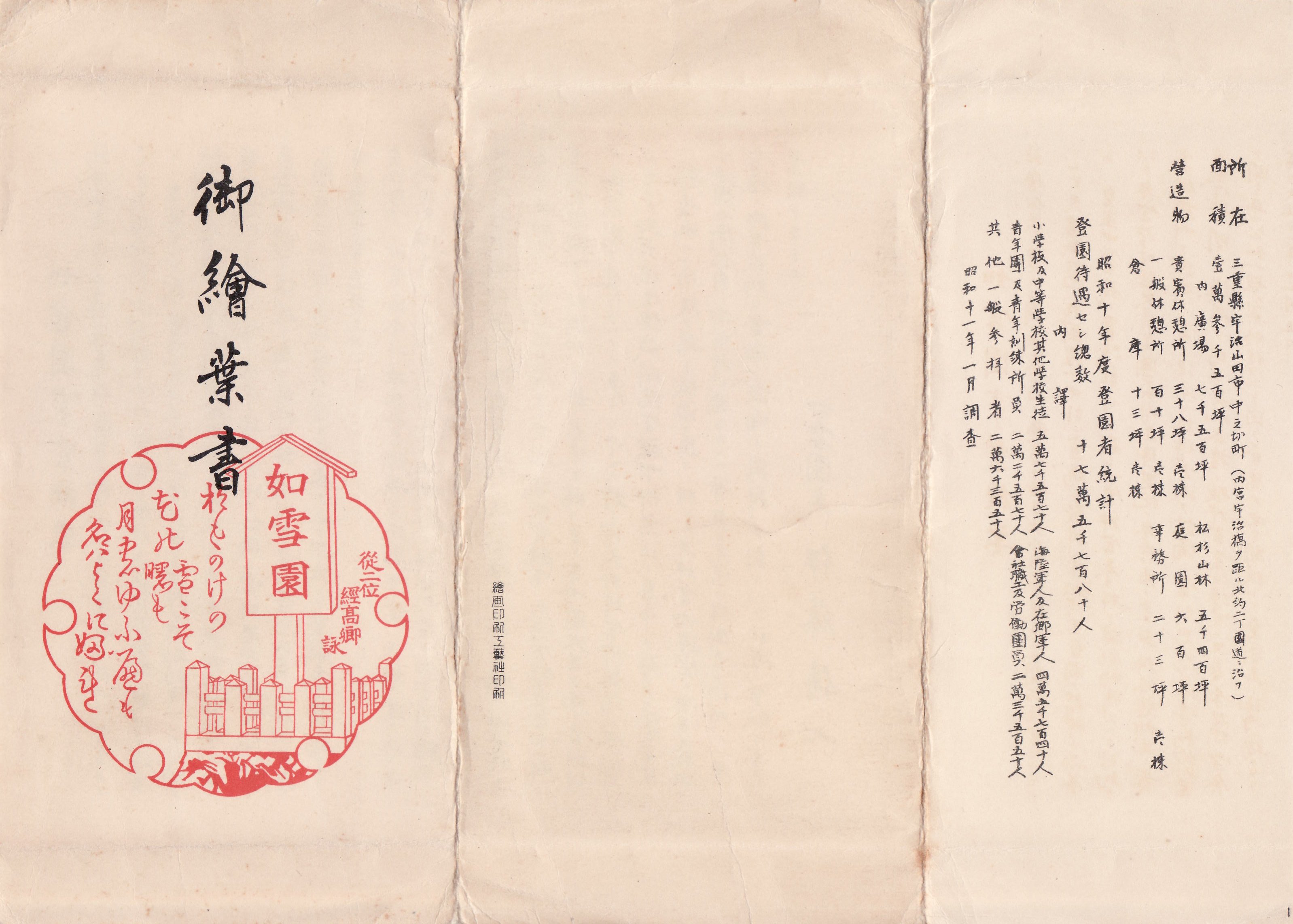 表面の右端には如雪園の概要が掲載されています。以下引用します。旧漢字を新漢字に、片仮名を平仮名に改めました。