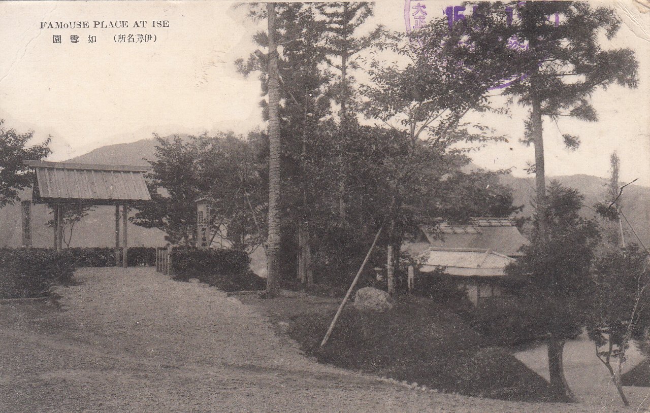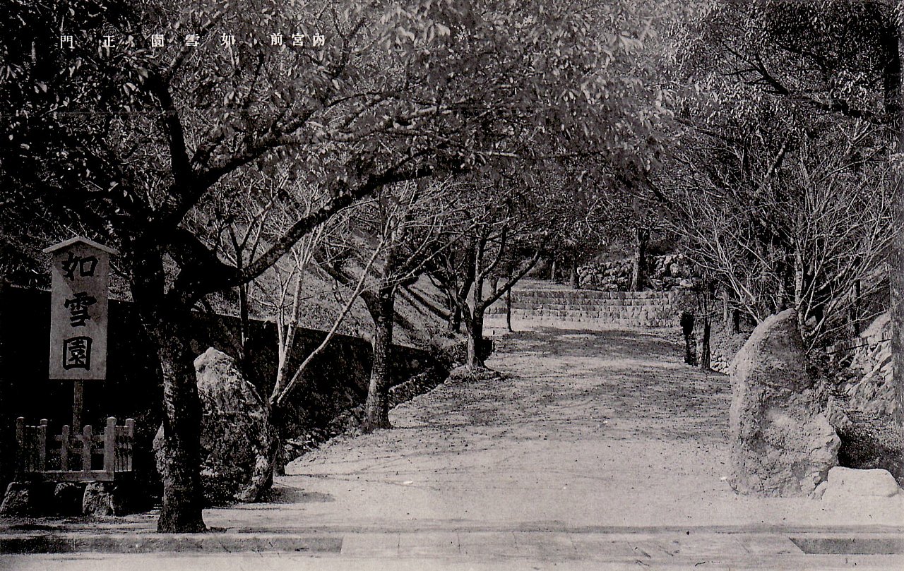 如雪園は、現在の神宮バラ園の地にありました。大正9年に大阪の篤志家帯谷傳三郎が開拓・経営したものです。ここは内宮禰宜・中川経高の山荘があったところで、その庭園には雪が降る如く花々が咲き乱れていたといいわれています。中川経高の歌である「おもかけの 雪こそ花の 曙の 月の夕も 名は世々にふれ」に因み「如雪園」と名付けらました。