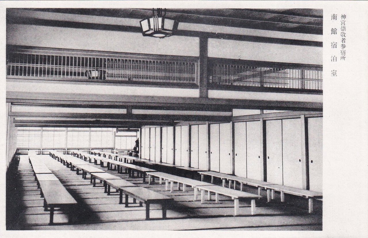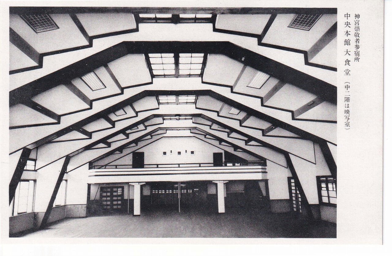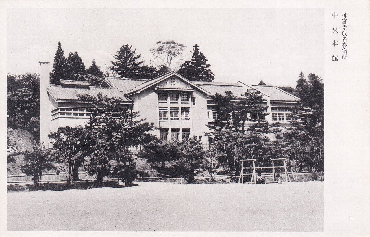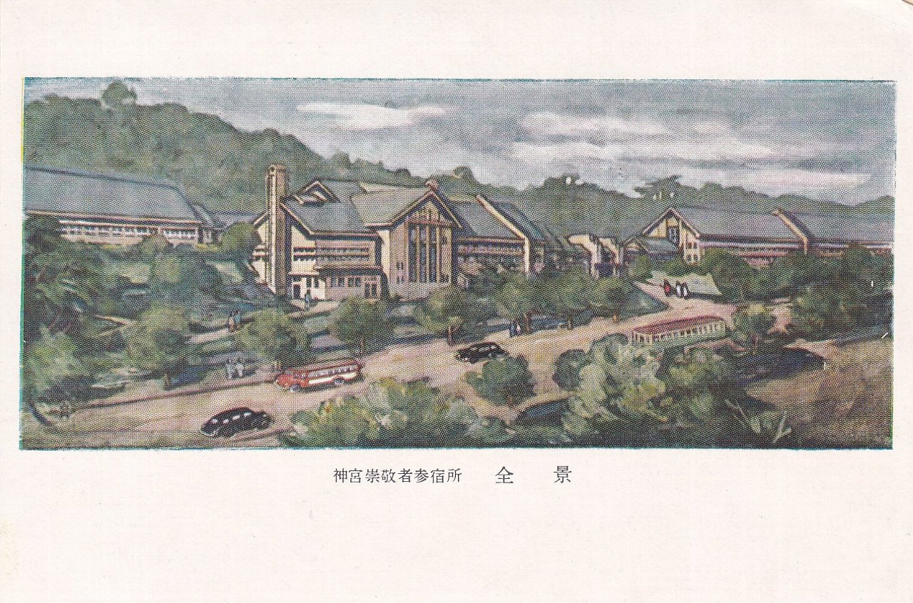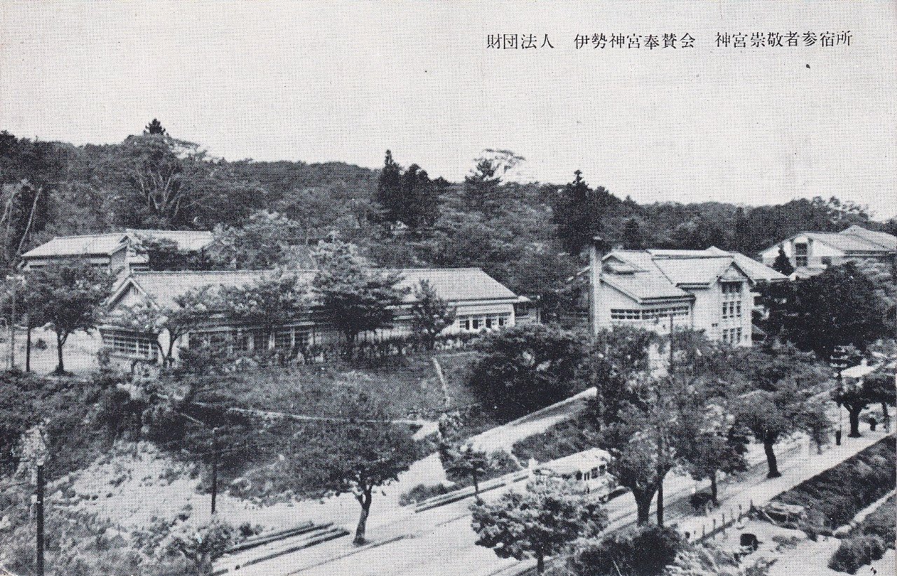 神宮崇敬者参宿所は、神宮の一般財団法人である伊勢神宮崇敬会が運営する宿です。現在は「神宮会館」と称されています。絵葉書たとうにも記載があるとおり、第59回神宮式年遷宮の附帯事業として、参宮者の便宜を図り神宮崇敬者の強化を目的に昭和28(1953)年秋に竣工しました