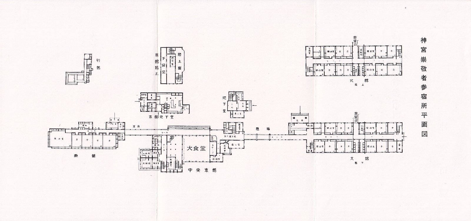 左:中央本館 中:中央本館大食堂(中二階は映写室) 右:南館宿泊室