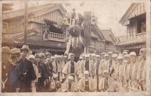 右写真中央奥に「三重刑務所 宇治山田出張所」の看板が見えます。『宇治山田市史』には、大正13年12月に「三重県刑務所宇治山田支所」から「出張所」に改称されたとあります。よってこの写真は大正13年以降のものとなります。昭和の御木曳は全身白装束でした。この写真は普通の法被姿ですので大正15年の御木曳のものです。現在の津地方裁判所伊勢支部のあたりです。