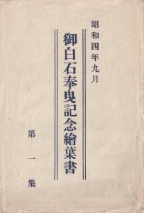 神宮 お白石持 昭和4年のお白石持 1 尾上町のI様が所蔵なさっている、昭和4(1929)年のお白石持の絵葉書を紹介します。 昭和4年9月 御白石奉曳記念絵葉書 左:たとう表面 原寸:長辺14.5㎝×短辺10.1㎝ 中:たとう裏面 右:絵葉書表面 原寸:長辺14㎝×短辺9.2㎝