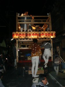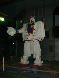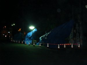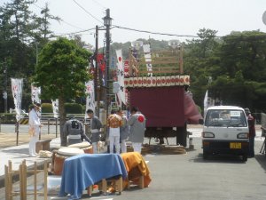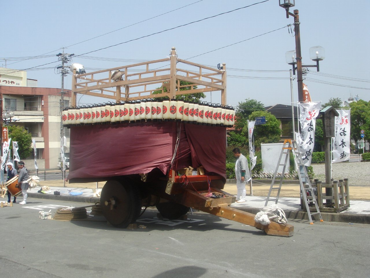 ブルーシートが掛けられた奉曳車 高柳商店街のガンダム