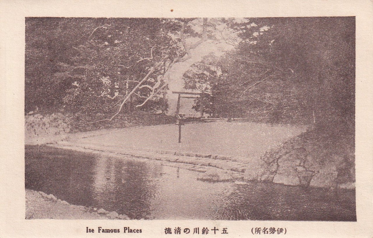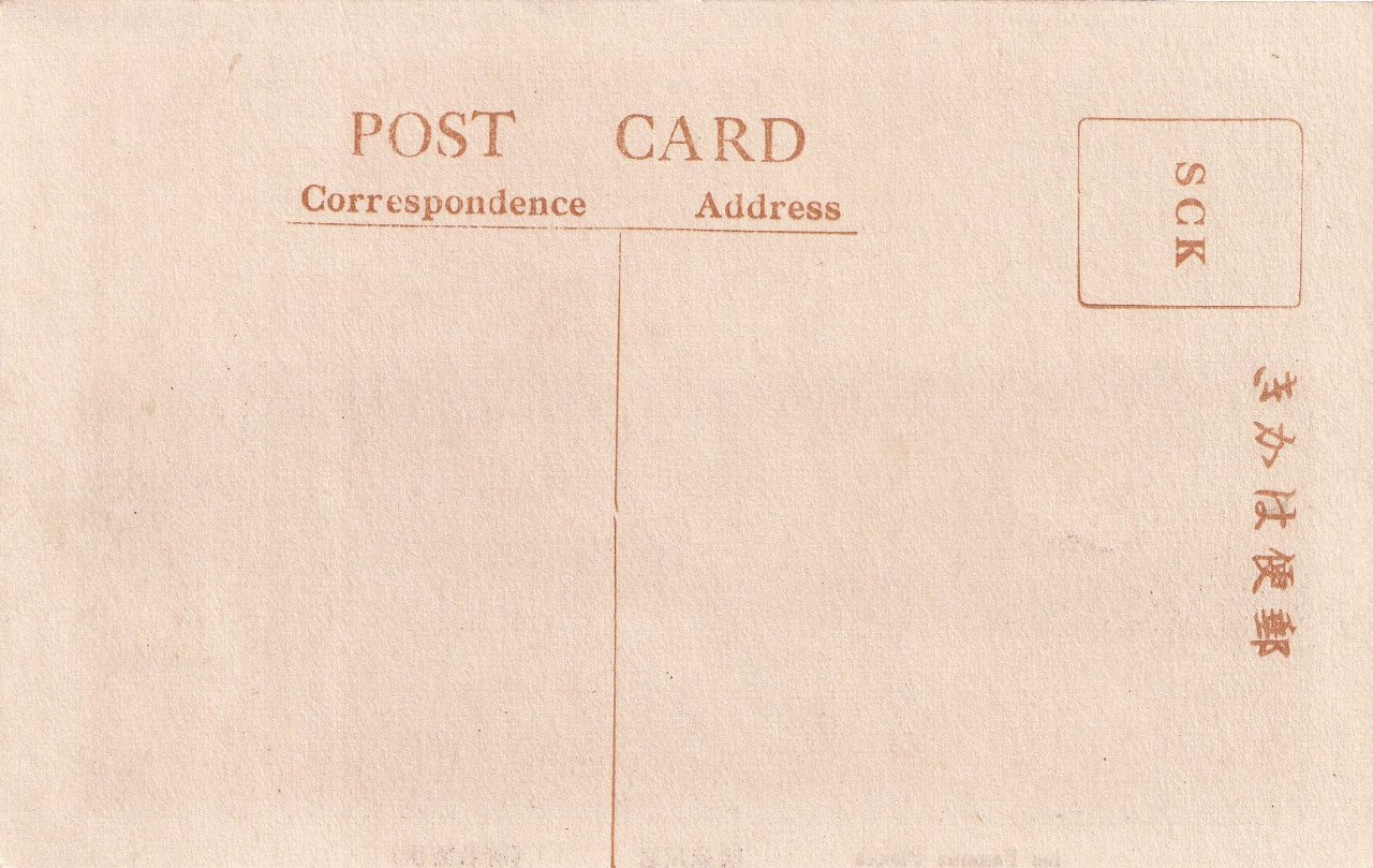 宇治山田駅や歴史館の写真が含まれていますので昭和5(1930)年以降に発行された絵葉書集だと考えられます。画像はよくありませんが、他の絵葉書集には見られない写真が含まれています。発行所は不明ですが、表面切手貼付欄に「SCK」のマークがあります。32枚ありますが、「宮川の桜」が3のみしかない、「明野飛行場」の1がない、外宮に関する写真がない、内宮宇治橋が2枚あるなど過不足がありますので、当初何枚組のものであったかは不明です。