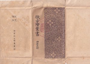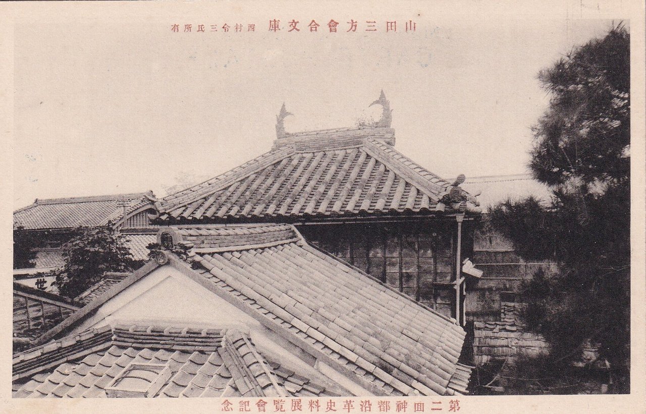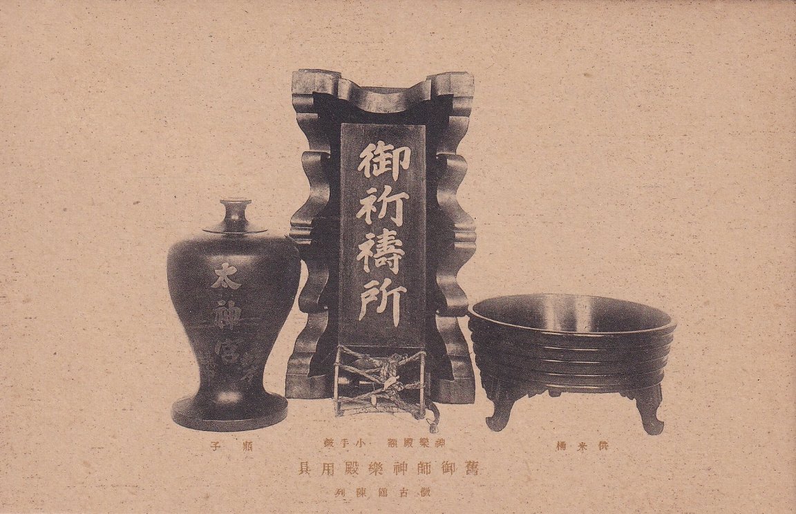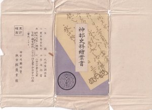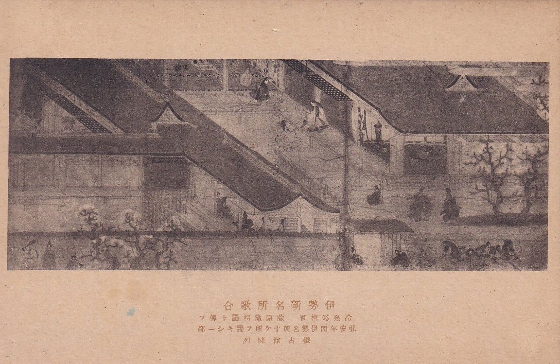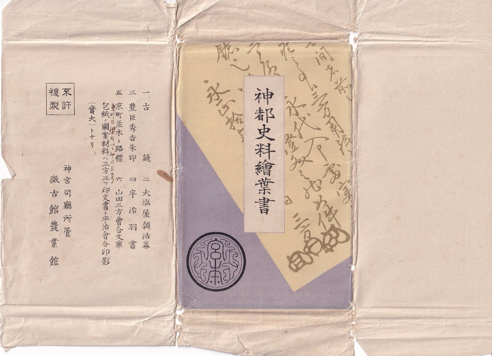 神宮徴古館農業館発行の『徴古絵葉書 神都史料』を紹介します。表面の罫線が中央に引かれていますので、大正7(1918)年以降の発行です。たとうには「神宮宝物??? 仮徴古館」のスタンプが捺されています。徴古館は明治42(1909)年に開館しています。スタンプの館名が「仮徴古館」である理由は不明です。