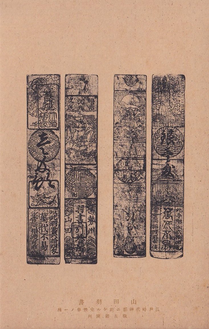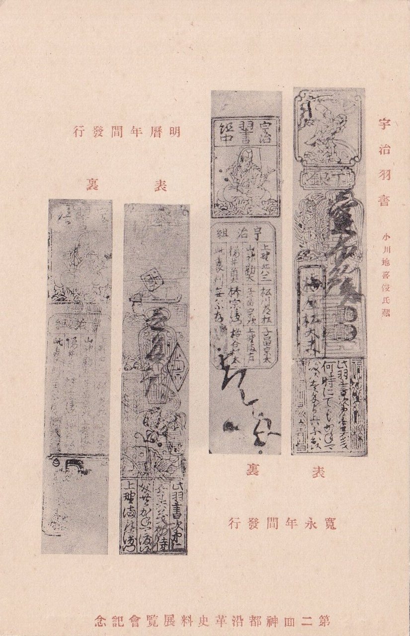 左:宇治羽書 小川地喜俊氏蔵 右上=寛永年間発行 左下=明暦年間発行 (それぞれ右が表・左が裏)